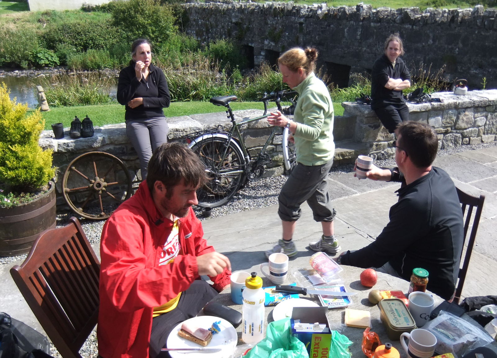 Our accomm was a cracker, a chunky old farmhouse converted into a best-practice modern hostel. We dried off with a pot of tea and sandwiches in the pleasant garden (pic). What could be better after a rainy day cycling.