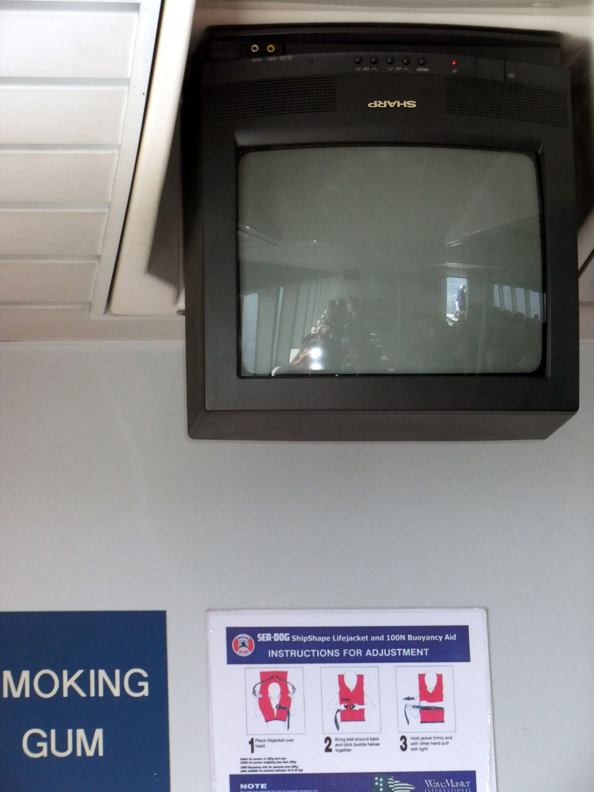 This one, indeed, had TV screens for the safety demonstrations, thoughtfully installed upside-down (pic) so they could be conveniently viewed in the event of a capsize.
