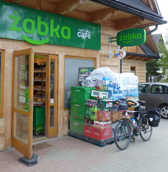 There was some climbing today, most of it a medium-strength haul up and out of Nowy Targ, with my last glimpse of the Tatras (pic). The road was quite busy, and I was glad I had (a) a rear-view mirror and (b) my mountain bike, because I could see when to avoid the HGV approaching from the rear by dodging off to the bumpy gravel shoulder. Not as scary as it sounds. But it does sound very scary.