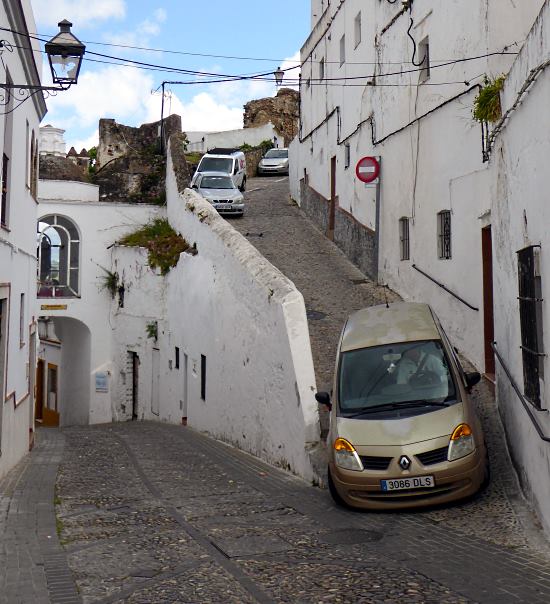 Fortified by a delicious tapa of solomillo con roquefort y patatas fritas and a beer, I dodged the tourists inadvisably driving their hire cars down Arcos’s cramped lanes (pic), many of them only slightly wider than a car, and only slightly narrower than their wing mirrors, and headed happily to my hotel.