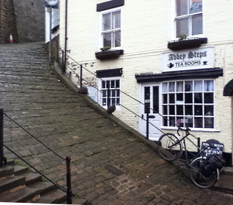 From the hostel it was all downhill into Whitby, some 100m away. Very steeply downhill, as you can see. The road, Donkey Track, is marked ‘Unsuitable for Motors’. Indeed. At the bottom, this photo suggests that the gradient is around 60 to 70 per cent. That would make it possibly the steepest in Britain, more precipitous even than the 40 per cent Fford Pen Llech in Wales. Wow. After climbs of max 6 per cent yesterday, and evening beers of about the same, that raises the bar for tonight’s drinking.