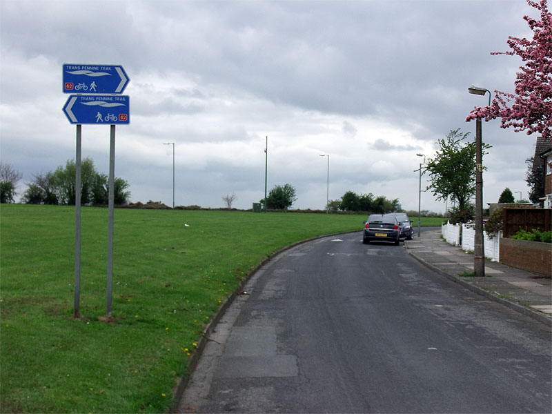 After hacking through Liverpool’s backside, on a rather dull railtrail, you get to Speke. And the words you speke are unprintable, because you keep losing the trail thanks to patchy signposting. Here (above) is an example. Note that you’re already *on* the TPT route. So what to make of this Janus-like sign, when there are no visible roads off right or left? The addition of a direction (‘east’ or ‘west’, as most of the signs in the western two-thirds have) would help here.
