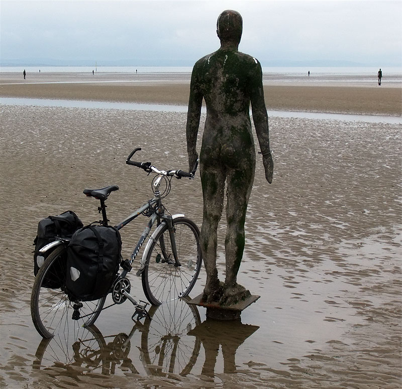 The work (detail, above) consists of a hundred life-size naked bronzes (of Gormley himself) staring out to sea. Depending on the time and tide, you see them submerged, hovering above the sand, covered in barnacles or slime, sunlit, rained on, blasted by storms etc. And depending on the proximity of bike bloggers, you see them grasping cycle handlebars. It’s excellent; go and see it.