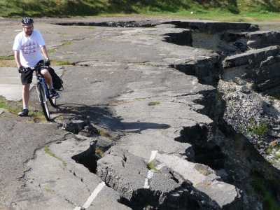 That’s John, negotiating the bizarre collapsed old A625 road that used to go over Mam Tor. After constant landslips, the roadbuilders abandoned it to the elements in the late 1970s. It now looks strangely like an earthquake zone in Chile or a Road of Death in Bolivia, instead of a Peak District path near Castleton’s tea shops.