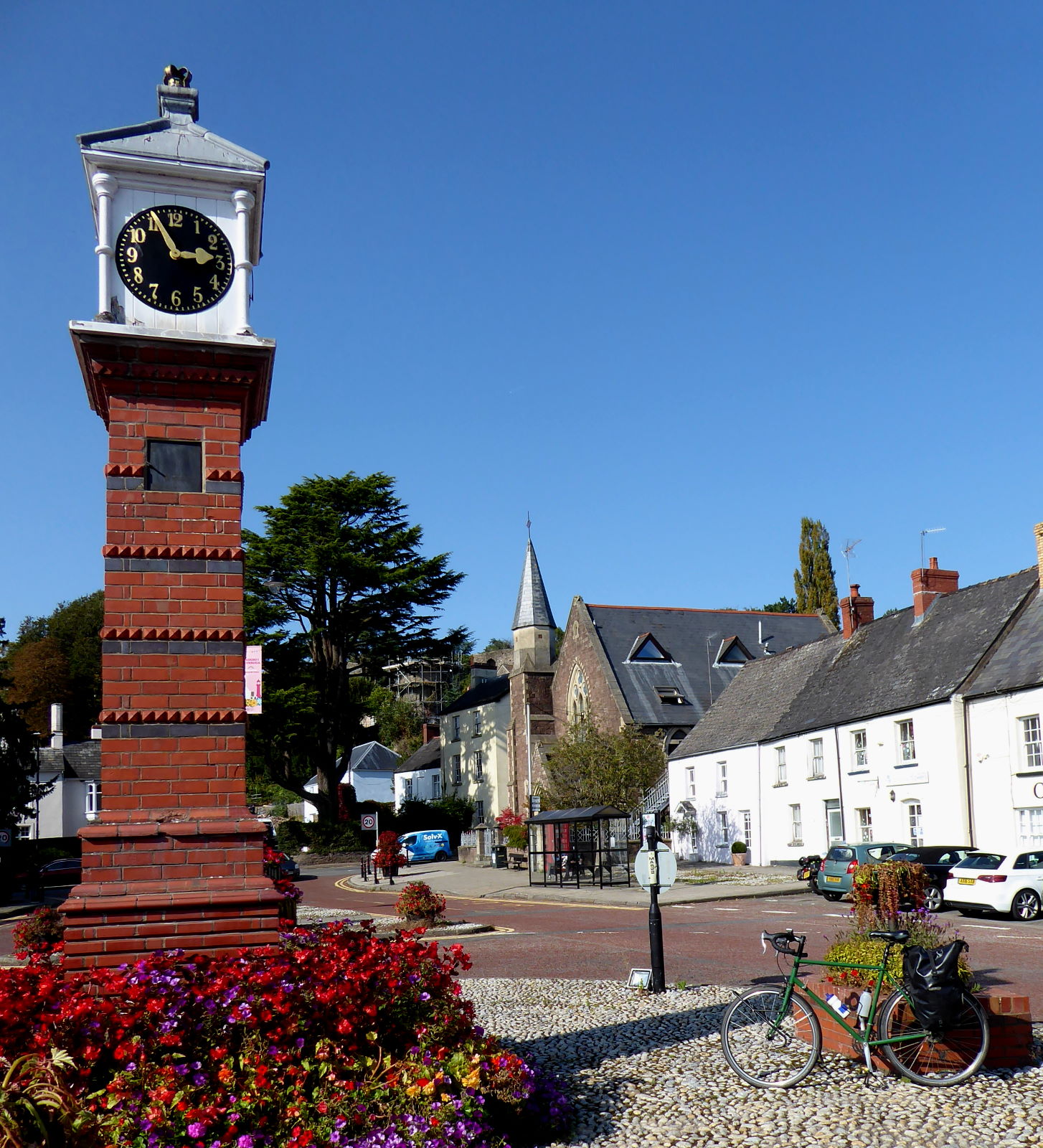 I stopped at Usk, town of flowers, for a picnic lunch. The central square (pic) had no shade and was a sun-trap, as I found when my packet of twelve jaffa cakes turned into a packet of one long jaffa cake.