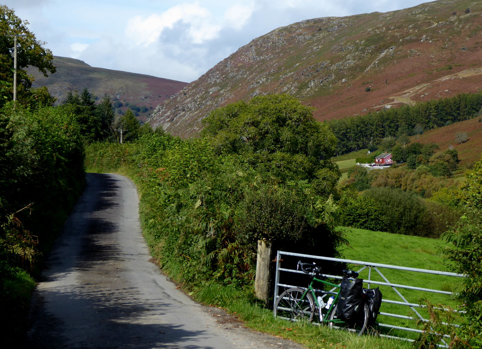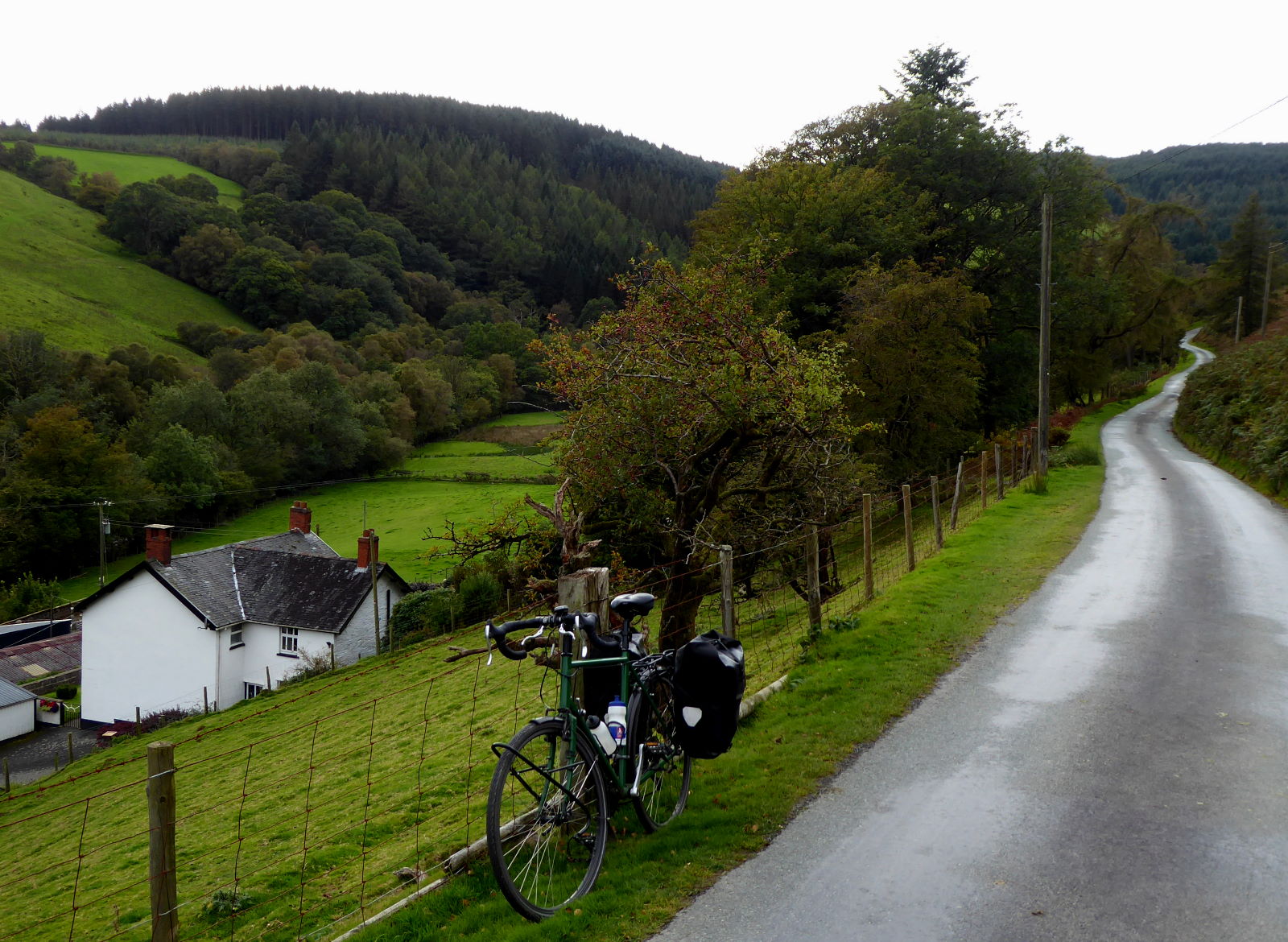 Between there and Llangurig, a tiny lane parallels the main road on the opposite side of the Wye. It’s lovely riding, effectively car-free and with constantly developing views (pic).