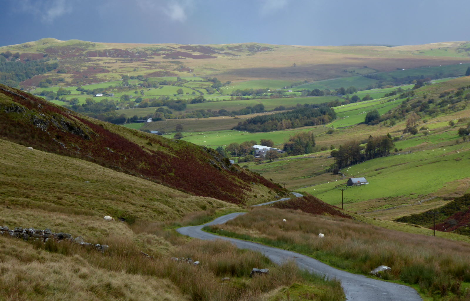 An early start, into the sheepy fields. I climbed laboriously up the mountain road towards Machynlleth past Dylife Gorge (pic).