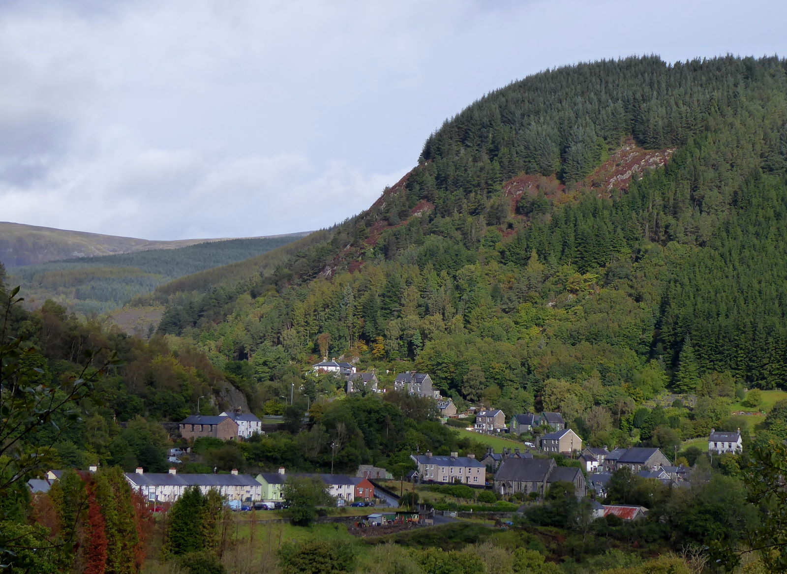 From here towards Dolgellau is one of the most splendid and Welsh-feeling stretches of the LLC, on a tiny lane that parallels the main road over the other side of the river through fragrant pine woods. I’ve been here, to pass or to stay at Corris (pic), several times and it’s always been raining.