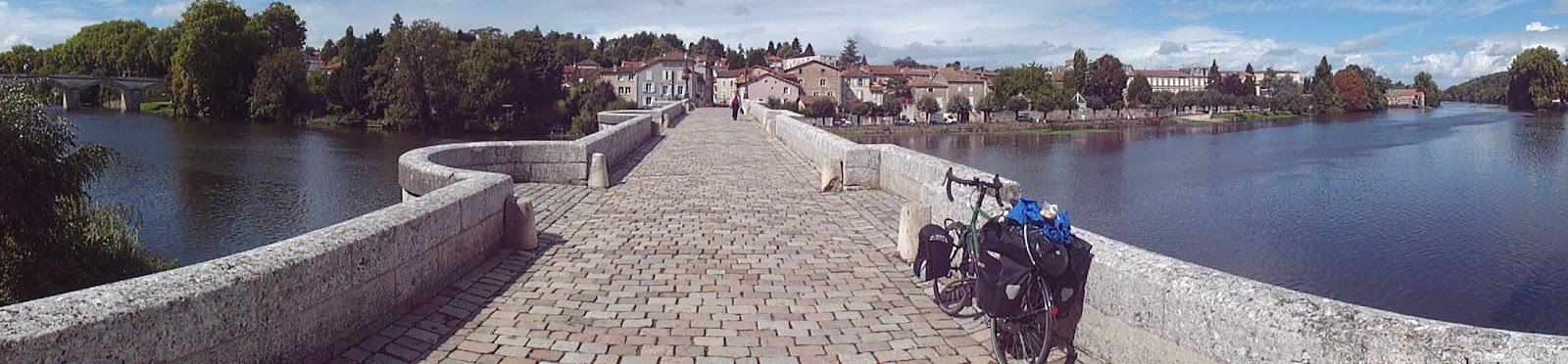 I managed to avoid rain all day, despite the gloomy predictions on www.meteo.fr, though I’m getting a bit tired of headwinds. Still, the scenery was good, especially when the route dived down to river-straddling towns such as Confolens with its ancient bridge (pic). Old customs still survive here, such as shops being closed on Mondays, just when you’re desperate to buy some ham or cheese to go with your baguette.
