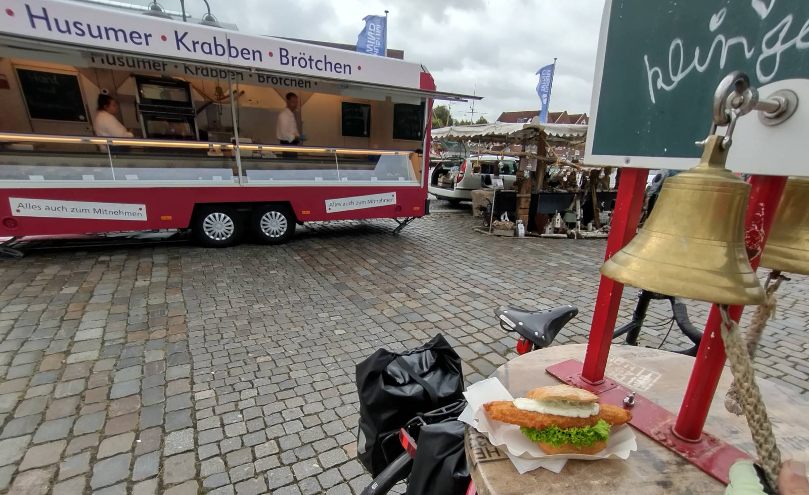 Oh: not even noon, and I was at Husum already. It seems the wind had been more tail- than the expected head-. I caught up on the breakfast I hadn’t yet had with a pain au choc and machine coffee from a petrol station. Now it was noon, ie lunchtime, so I enjoyed a Backfisch-Brötchen (fried fish sandwich) from a van in the tourist-centre harbourside.