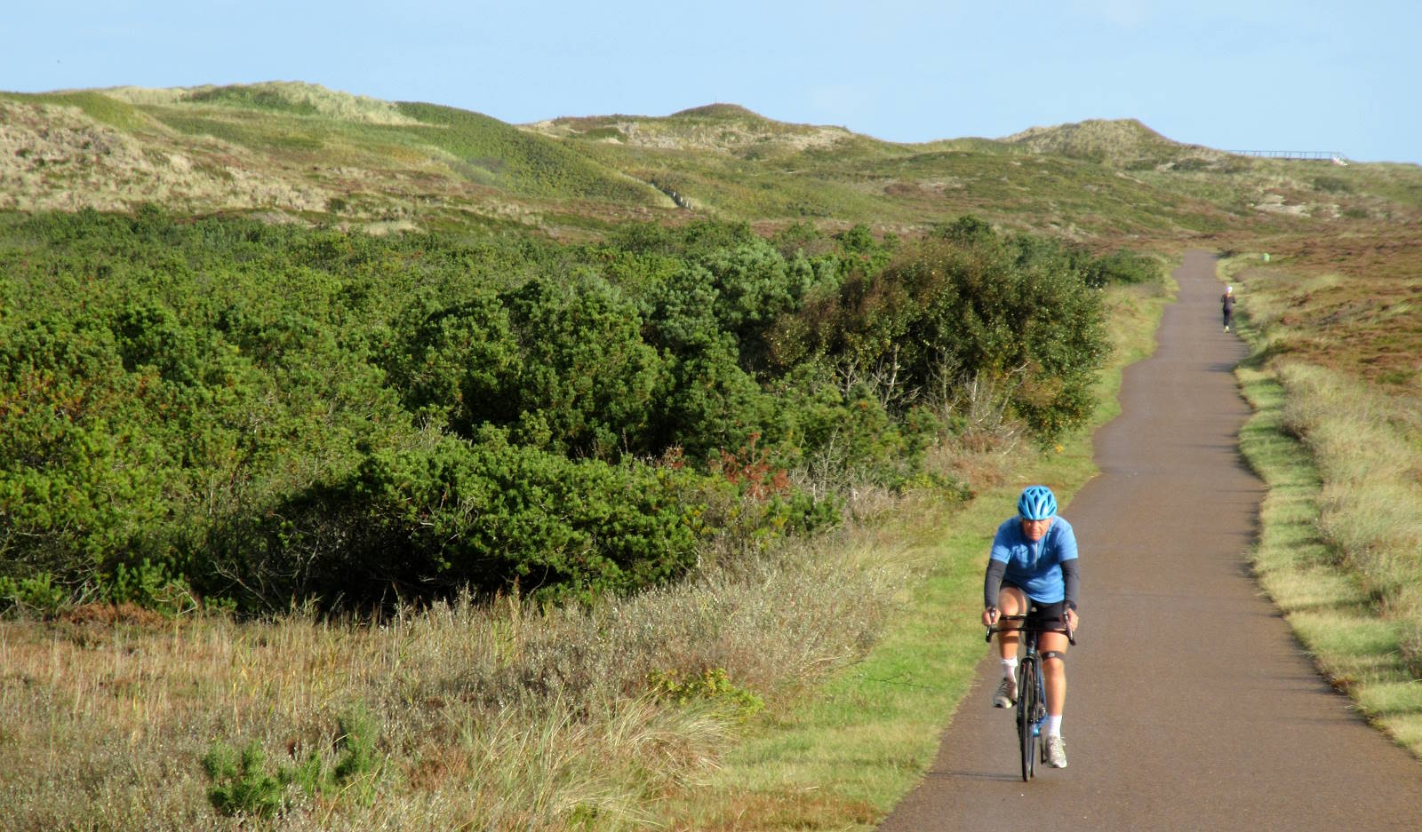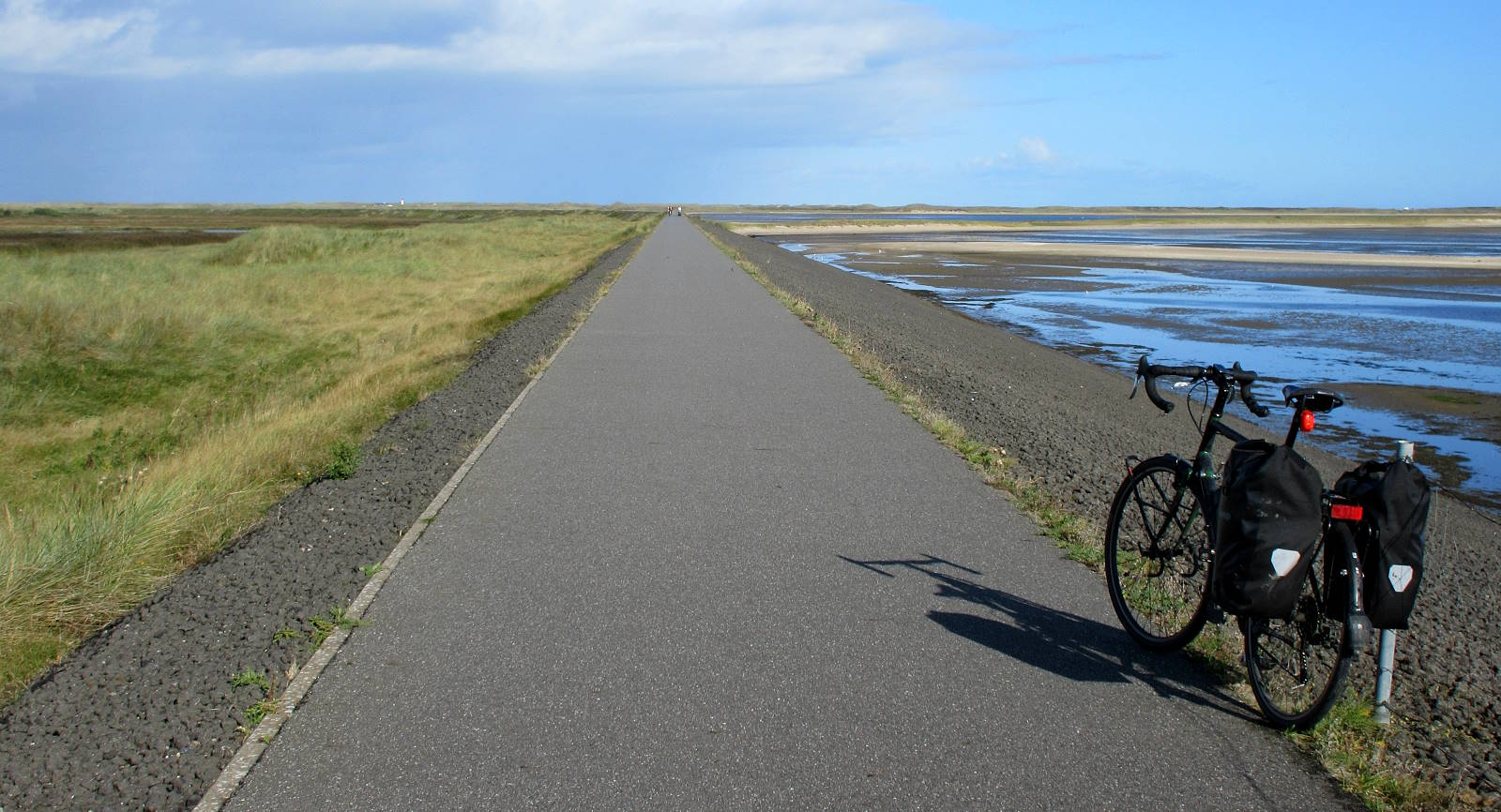 I had my final morning coffee and pastry of the trip at a petrol station nearby and took the breezy diketop cycle path along the shore towards Ellenbogen. All (well, almost all) smooth tarmac, with big-sky blues above me, wavy-grasses greens below me, breezy-sands yellows around, and the odd lighthouse in the distance for perspective.