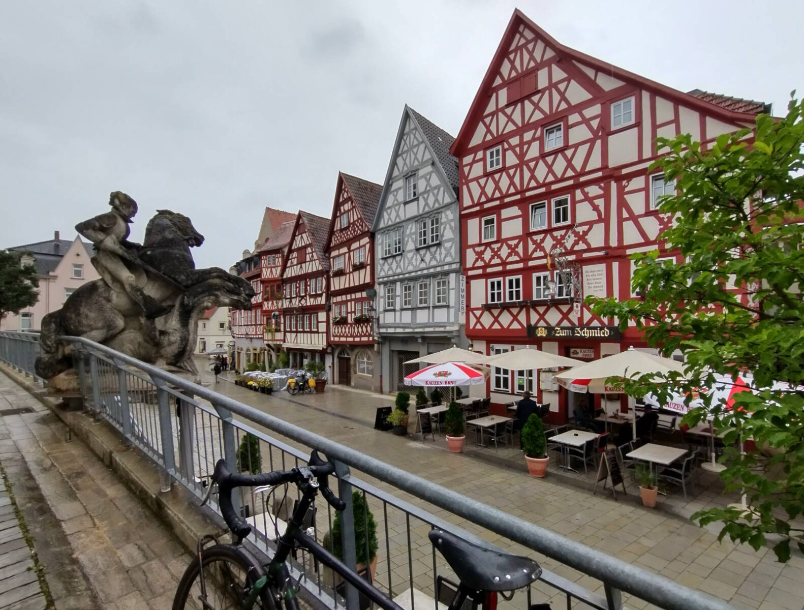 The rain picked up for my descent into Ochsenfurt’s old-town timberwork. I stopped off for lunch – well, Kaffee and Kuchen – in a cafe in the historic centre. Despite the weather, my waterproof cycle socks were still perfectly dry. That’s because they were back in my wardrobe at home. I’d forgotten to bring them, so had to do with normal sock/sponge hybrids.