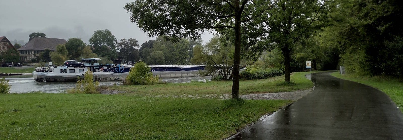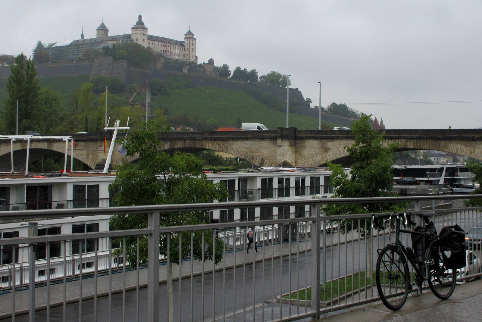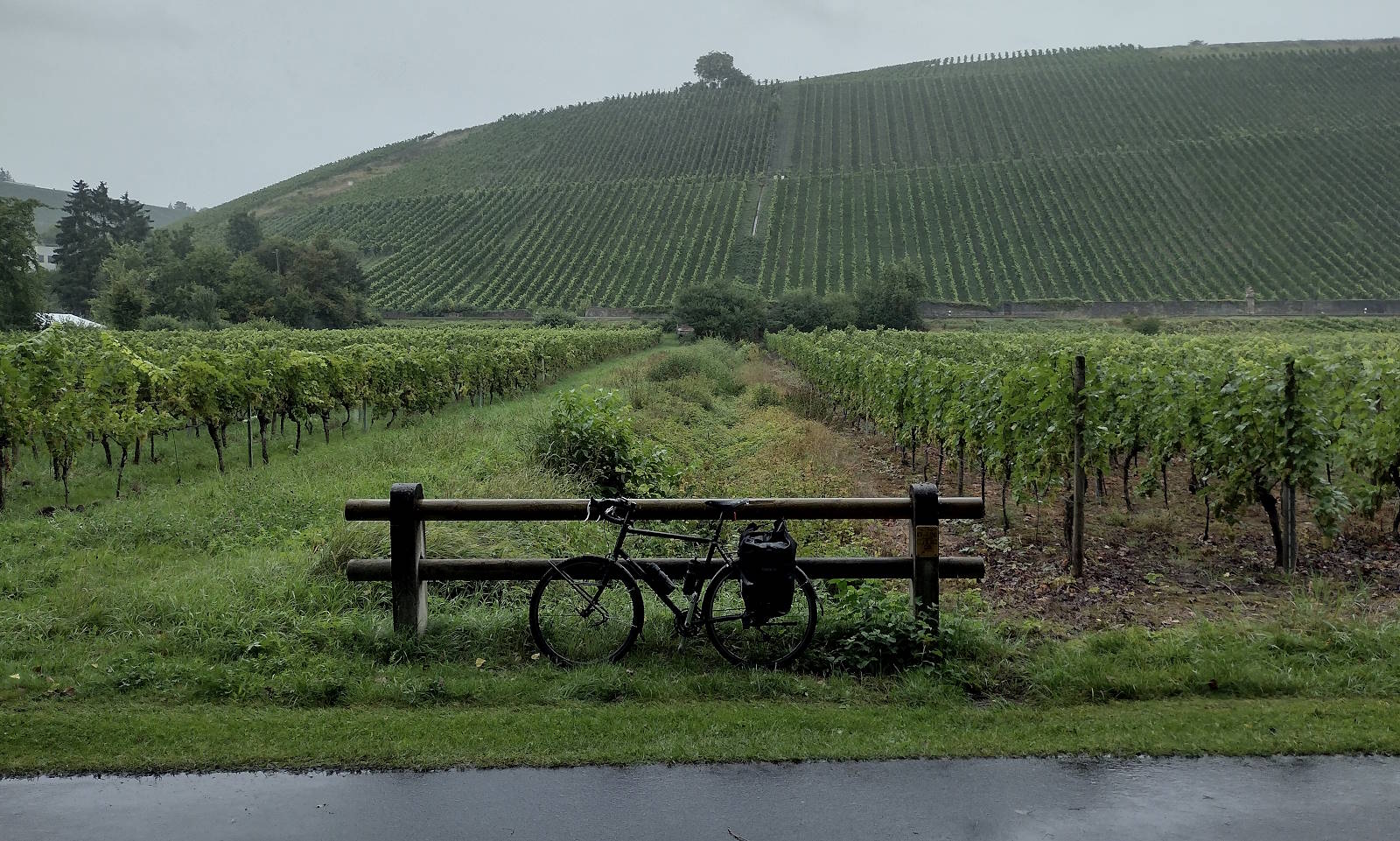 Anyway, from Ochsenfurt’s to my target of Würzburg was a long twelve-mile-ish zip along a wide flat black tarmac service road right alongside the alarmingly high Main river. I was in wine country now: the river’s south-facing slopes were lined with vines, which were in no danger of drying out today.