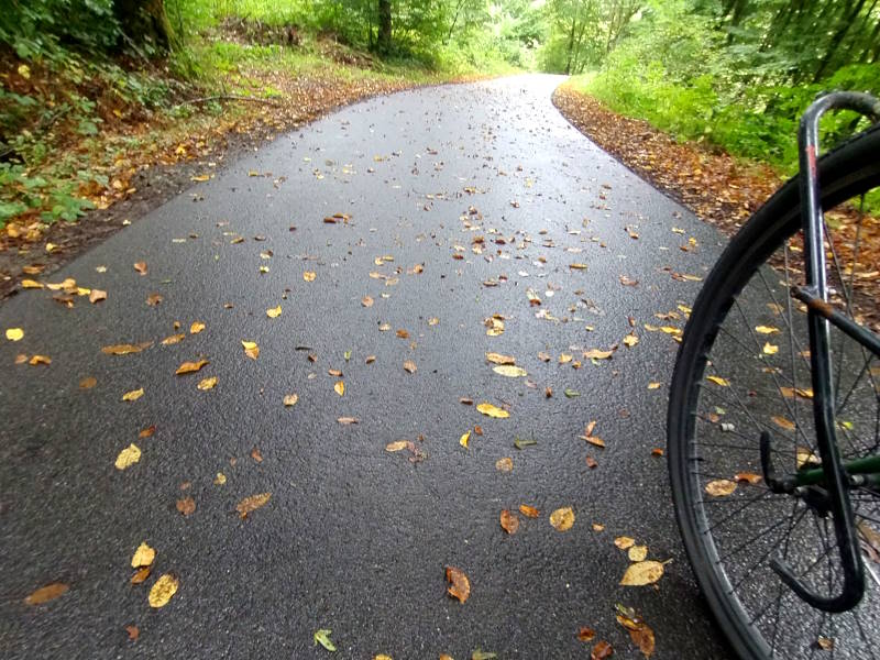 After Fulda’s modest old town I was back following the D9 route, and had the frisson of trusting the signs without any clue from my phone where I was – I’d forgotten to load the map for this area. It was all excellent, mostly flat alongside a river, and with nice sweepy views of villages. Many of the paths were shiny-black with settled drizzle, and strewn with autumn leaves glowing richly in the sunshine. Except when I tried to photograph them, when they went dull and brown.