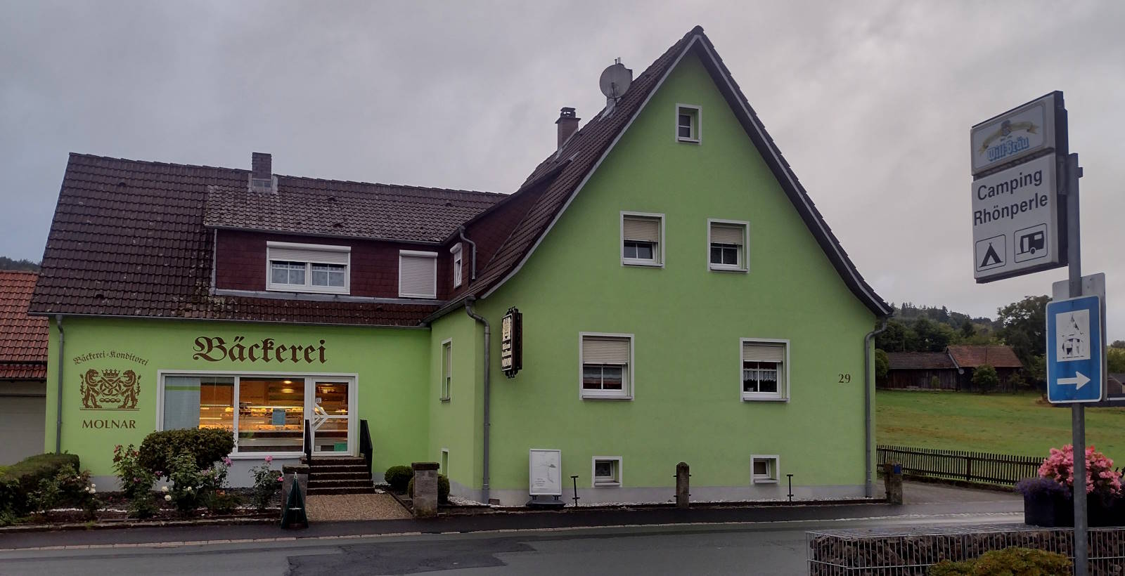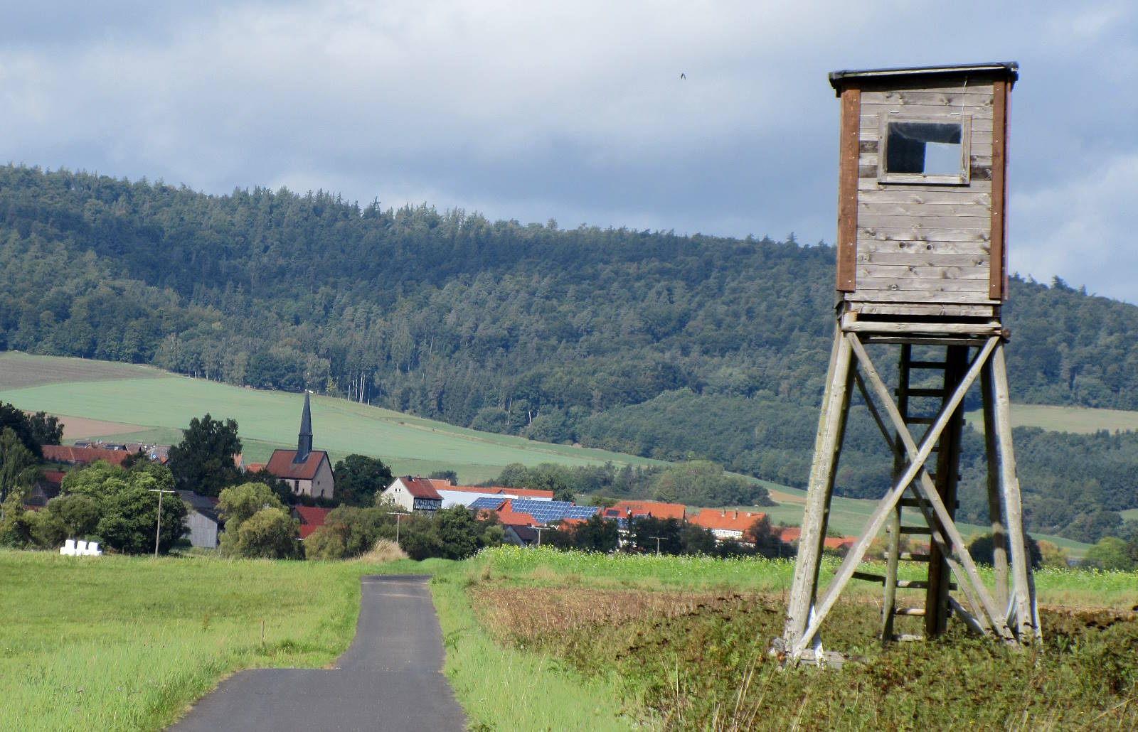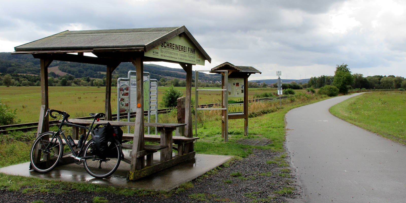 Rain showers came and went as I trugged along farmy flats crossed by main-road viaducts and sided by low slopes. I sat out a couple under bridges or in refuges. I picked up provisions for tonight at a Norma and followed suburban paths into Bad Hersfeld.