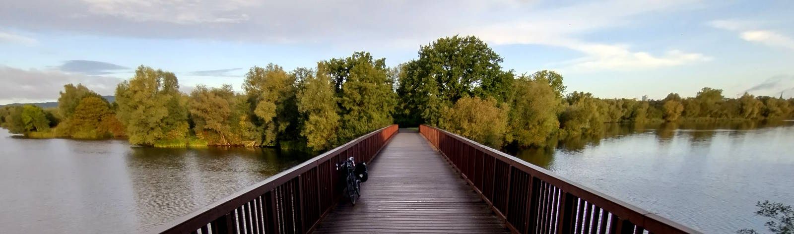This was lovely cycling. A gently bending river, emergent sunshine, a lovely cycle path, and a few fellow bikers gliding past. There were even a few cable ferries across the river here and there, much like there aren’t in England.