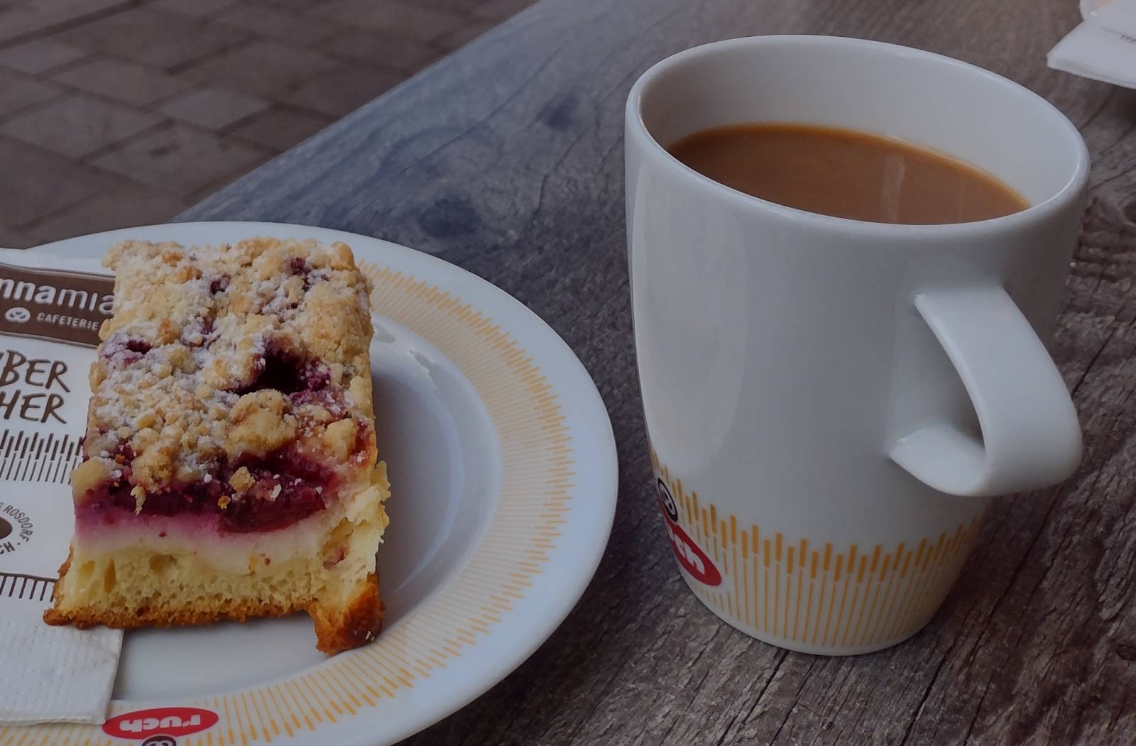 I sat on the patio table of a friendly little city-centre bakery and patisserie with my flat white and quark-berry-streuselkuchen thing, admiring the timbery old buildings and the young father bonding with his toddler in a bike trailer.
