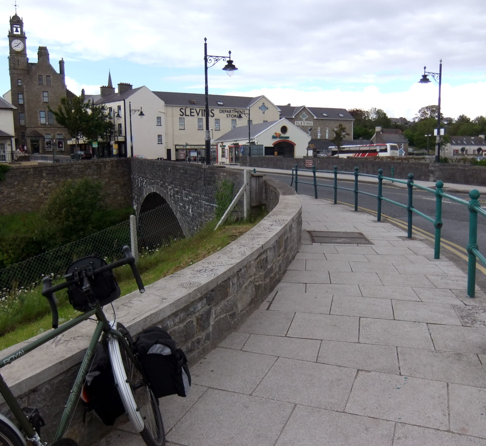 Now in Sligo, I lunched by the riverside at an old bridge. There were some nice trad shopfronts and old pubs, one of them with a bike parked in it, but Sligo felt a tad shabby, while not as rough-edged as Ballina. The waterside views away from the town were all grand, though (pic). Somewhere in the haze to the northwest were the mighty cliffs of remote, off-piste County Donegal; great to visit by bike, everyone said, but it’ll have to wait till next time…
