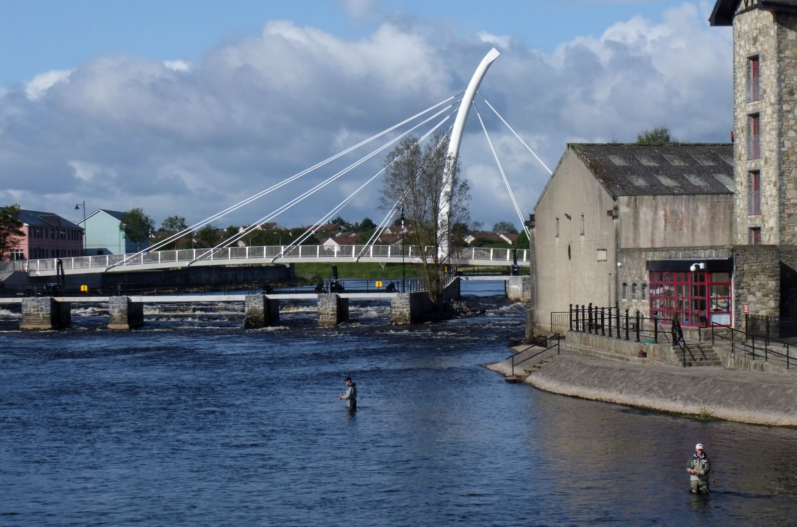 Ballina has salmon fishing right in the centre, and a few chaps this morning were wading in the clear waters angling for a fat ’un (pic). Their waist-length waders would have come in handy for me over the last few rainy days.