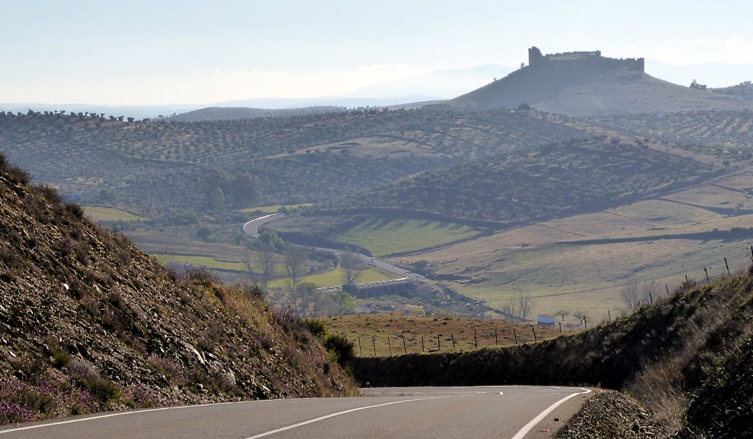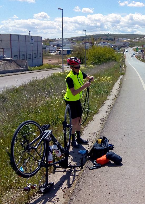 Shortly after our lunch stop in Zafra, Nigel got his second puncture of the trip, and we had to stop again for more roadside mechanics (pic). Not quite such an atmospheric view.