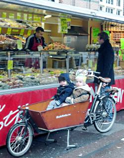 The bakfiets is a common way of transporting children around, such as this group in Albert Cuyp market (picture). The box is so big, it can accommodate two children, or one cheese.