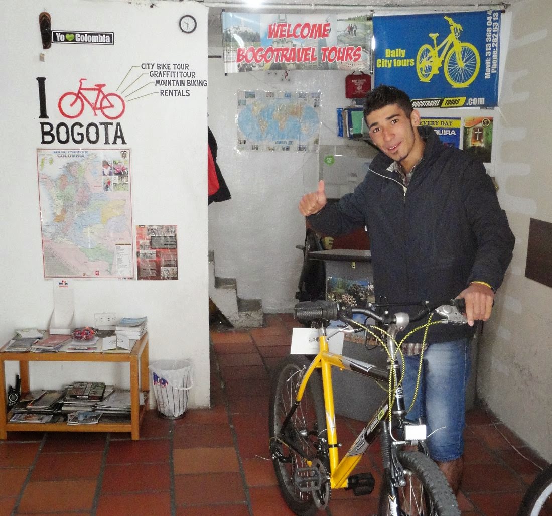 I hired a bike (pic) to take part. I chose it to fit in with the typical local model: a wobbly, rickety old MTB with dodgy brakes and moribund back tyre. (That’s not me, of course. That’s Fernando, from the bike shop. As is common in Colombia, a salsa band was practising opposite. I didn’t ask him if he could hear the drums though.)