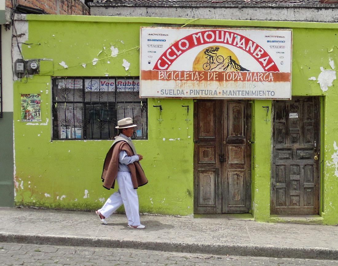 I hired a bike in Otavalo today, to explore the surrounding scenery and indigenous villages. I know two things from experience: if in doubt, hiring a bike is always the right thing to do; and it’ll always be too small for my 33″ inside leg. Both proved true again, as I cycled a few kilometres into the hills outside the town, enjoying the fine scenery, when it wasn’t being blocked by my knees.