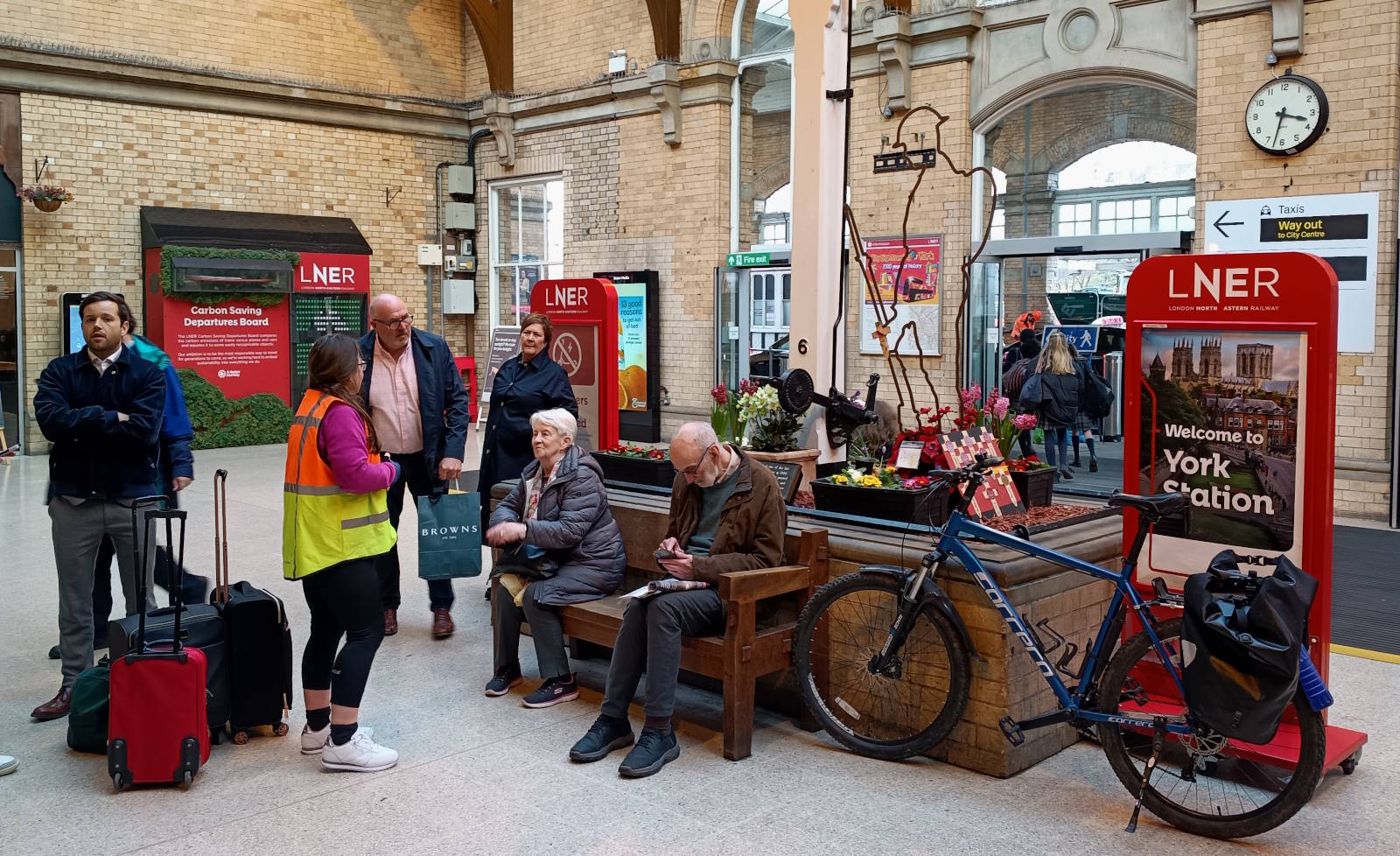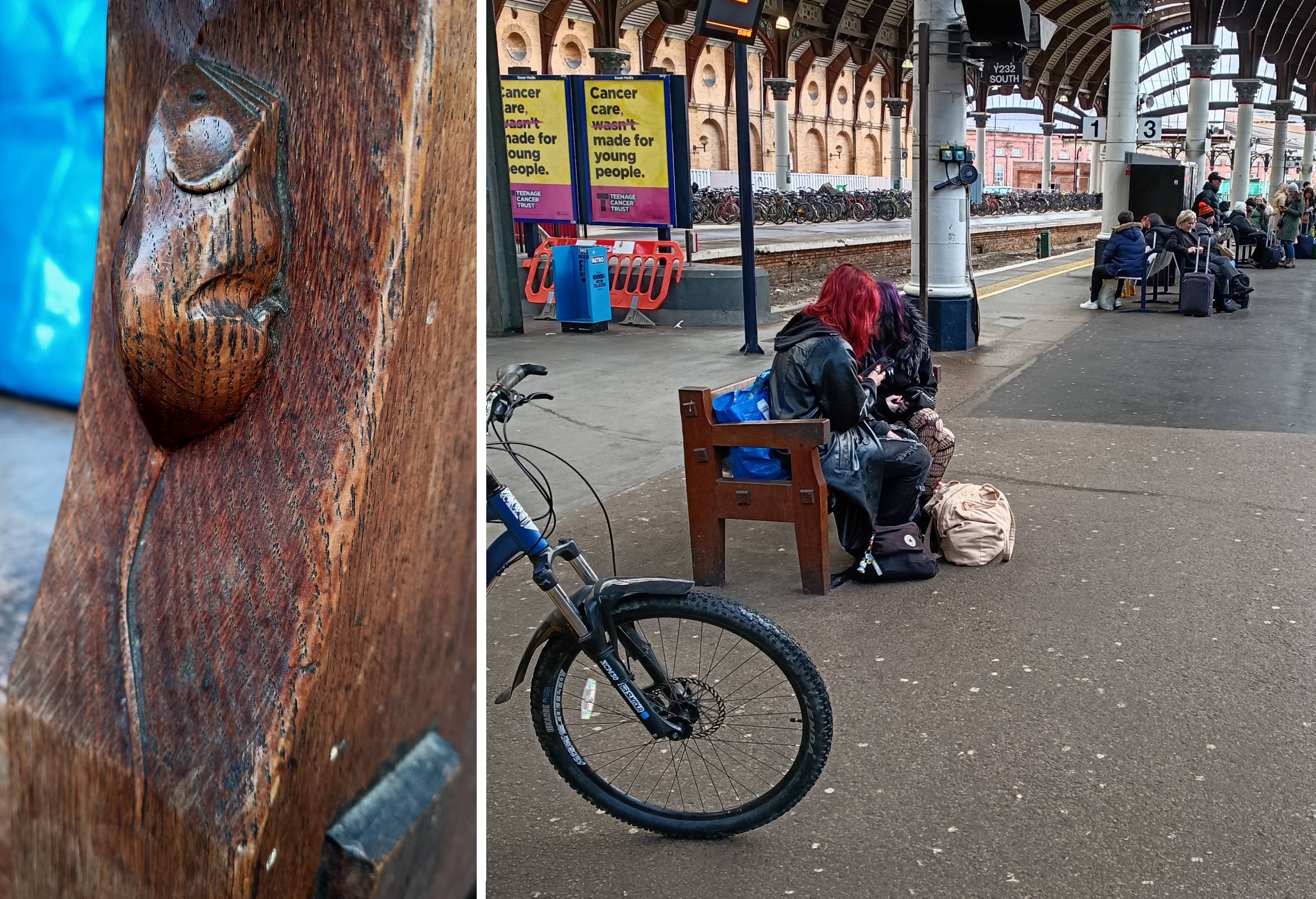 In the entrance to York’s fine station is your first mouse, on a bench by a planter. (The planter gained notoriety during Covid lockdown when it was taken over by a goose family.)