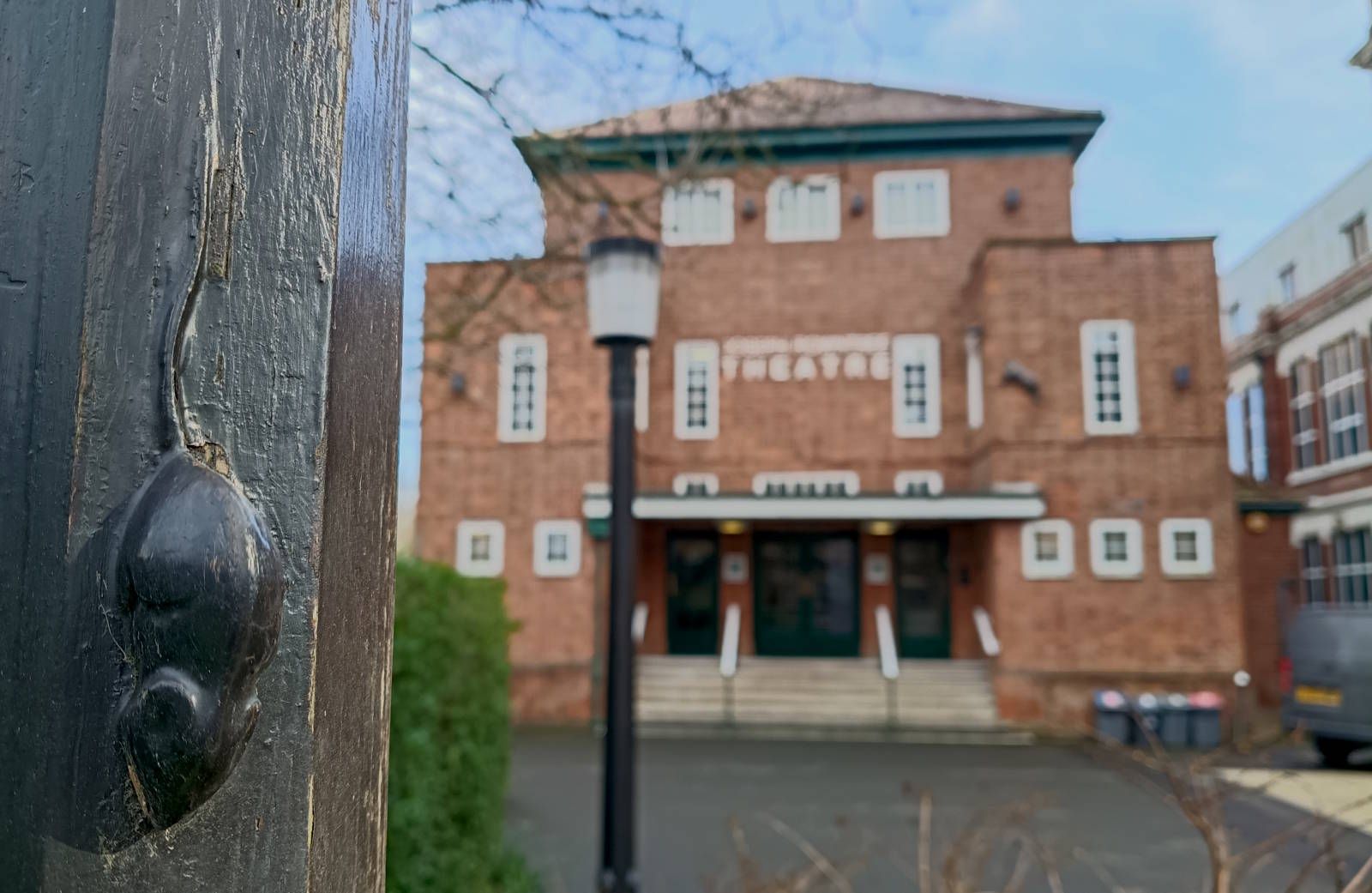 The three mice are at different heights: the first low down, the last high up. On the facade of the theatre itself, a metal figure of a cat is scrambling along in search of something to maraud. Luckily it seems not to have noticed our little furry chums.