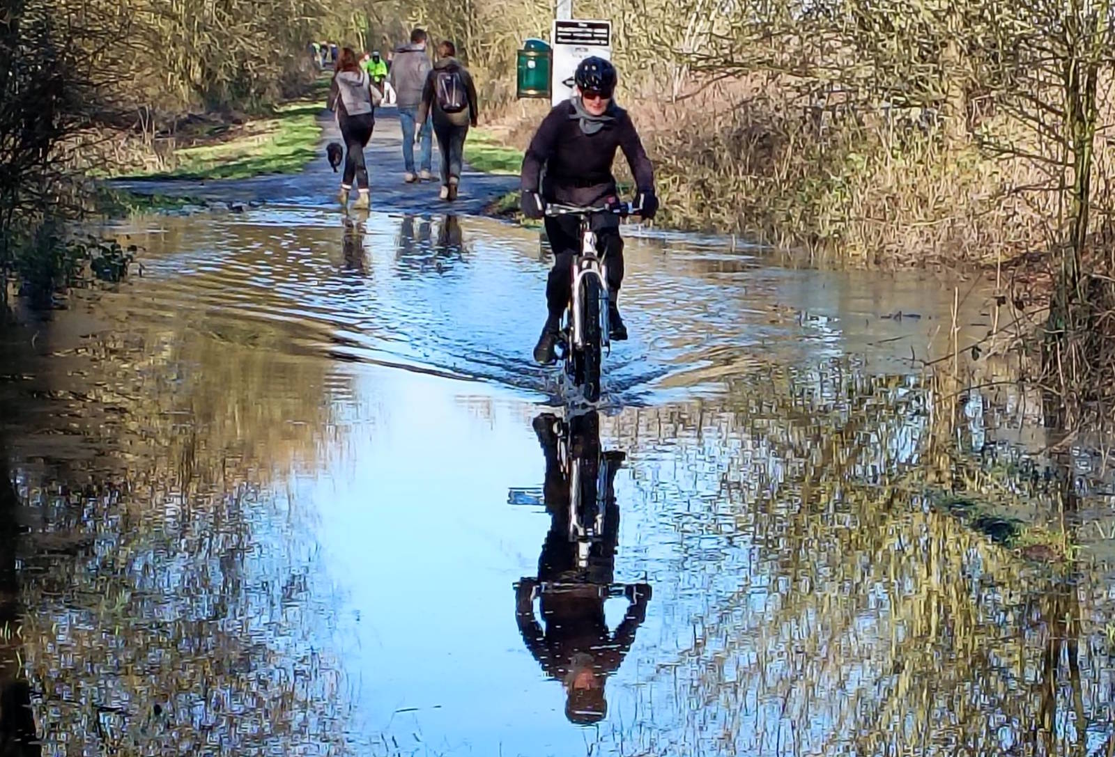 After prolonged wet spells, such as we’ve had all year so far, a patch near Naburn turns into a micro-lake, as it did today. Thanks to the sunshine, though, I had some nice reflections of amphibious cyclists to photograph.