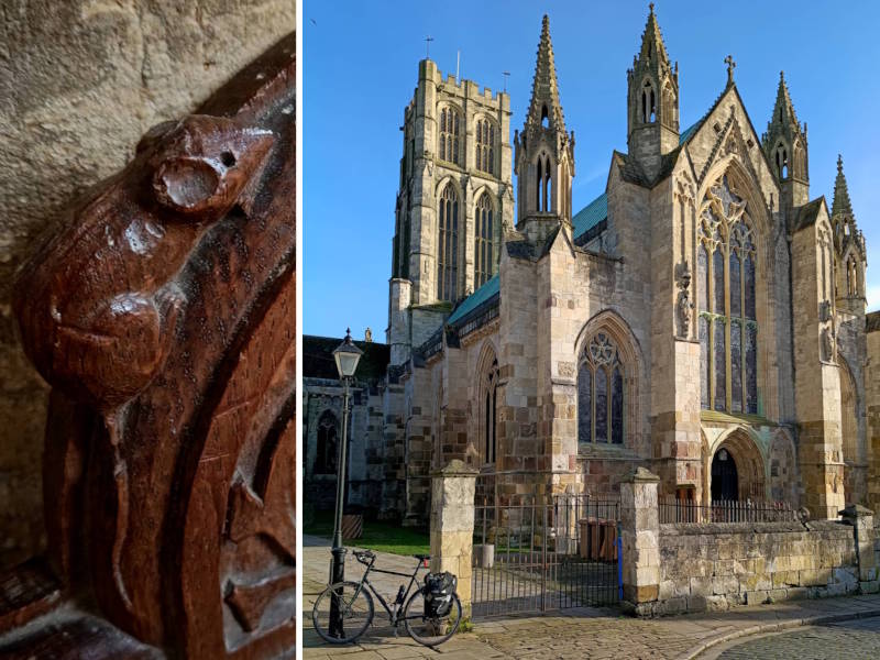 The cute rodents are decorative, carved into the woodwork of the Minster’s pews, stalls and cupboards. All these came from the workshop of Yorkshire craftsman Robert Thompson of Kilburn. He hid mice into all his carvings, a jokey reference to being as poor as a church mouse. As a cycling writer I know the feeling.