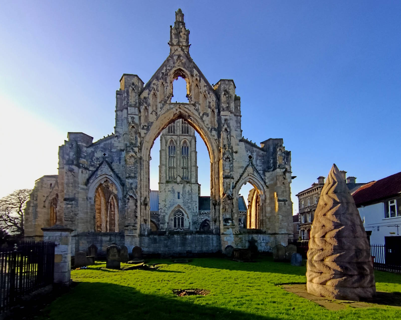 The east side of the Minster offers an unusual aspect. In front of it is the ruins of the old minster, plus a curious modern pointy addition that was no doubt a good idea at the time but which looks a little puzzling now. It doesn’t have any mice on it. It might benefit from one or two.