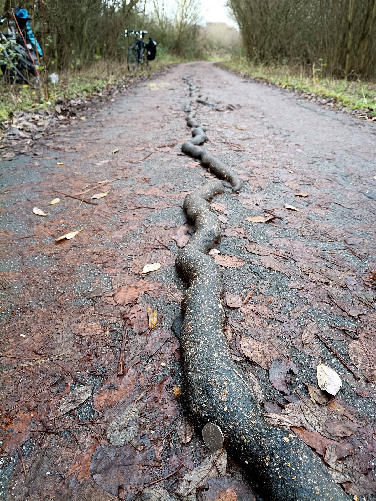 The snakes/sausages are rock-hard ridges along the direction of travel of the hitherto smooth, car-free, flat bike path linking northern York – the Nestlé factory that makes Kit Kats, in fact – with said model village. They range in height from about 2–6cm, and in length from a few centimetres to a several metres. They’re perilous extrusions, like tree-roots’ evil mutant twins: we know of a few unlucky riders who have come a cropper on them here, tramline-like, when cycling the path in the dark.
