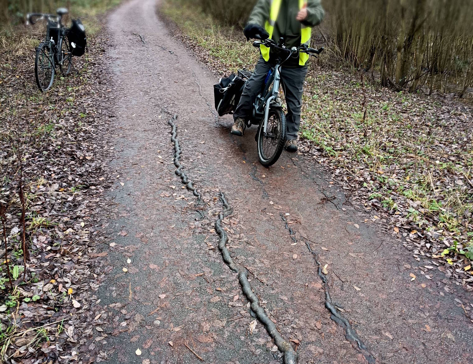 Climate change is to blame, it seems. Long, unprecedented dry spells in the summer formed lengthways cracks in the path, wide enough to swallow a front wheel. The council diligently filled them with some sort of tarry goo.