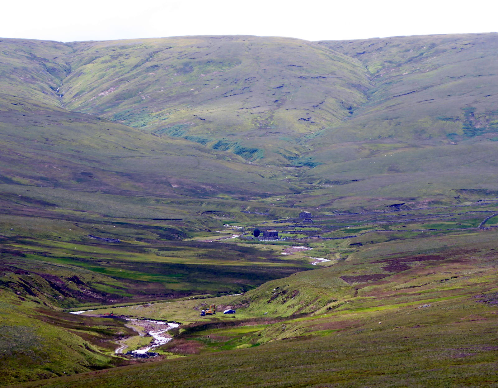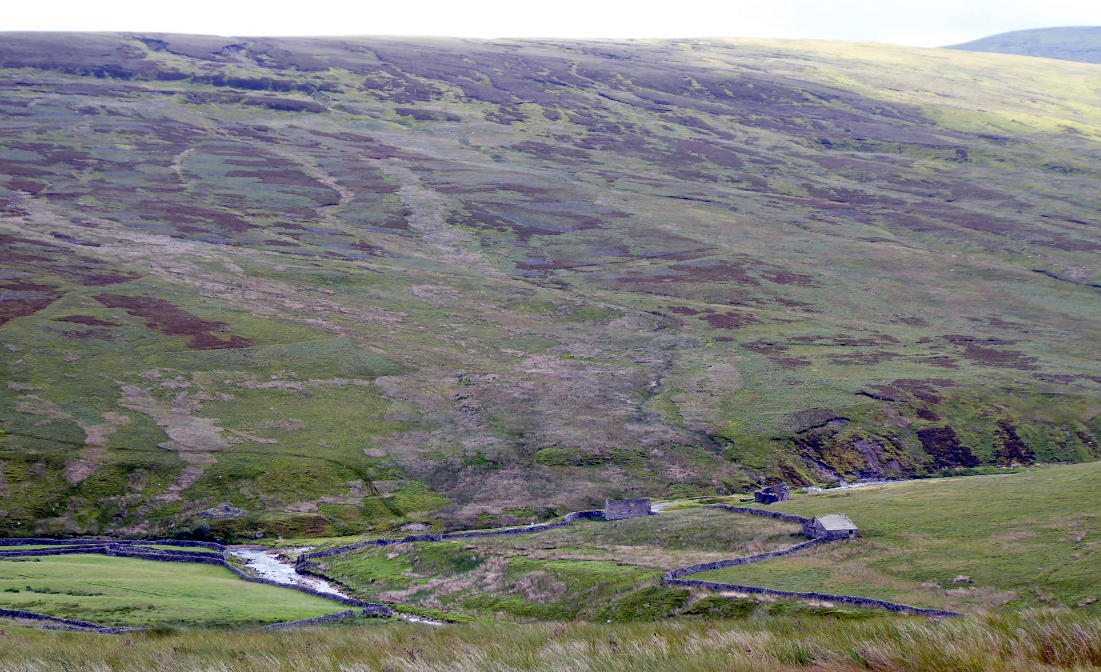 This is where the Swale begins, though not its source (pic). Round about where that farmhouse is, Great Sled Dale Beck and Birkdale Beck join, and from here it’s the River Swale. The name comes from an Old English word meaning ’fast-moving and quick to rise’.